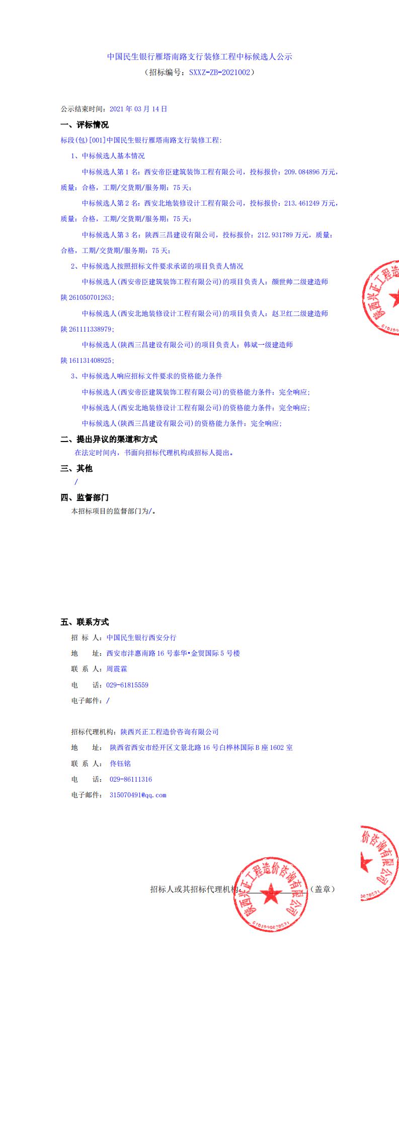 中国民生银行雁塔南路支行装修工程中标候选人公示